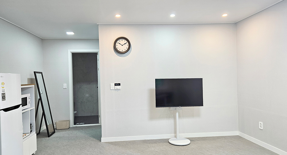 TV, 퀸침대, 식탁, 에어컨, 전자레인지, 커피포트, 전기밥솥, 토스터기, 식기일체, 드라이기, 수건, 샤워용품일체 등